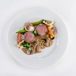 - 180 g / 200 g (obalený v kelovom liste, restovaná cibuľka, fazuľové lúsky, zaúdený zemiak s maldon soľou, jemný slivkový demi glace)7