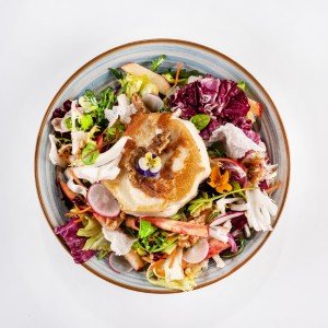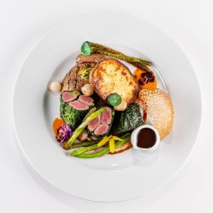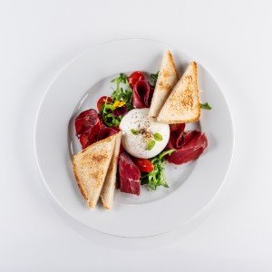 - 300 g / 180 g (hovädzia prémiová sviečkovica Black Angus, gratinovaný kozí syr, brusnice, červené korenie, rukolový šalát v parmezánovom košíku, zadymené studeným dymom)7,8,9