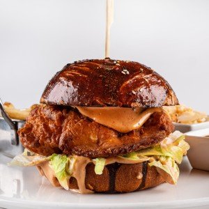 - 180 g / 500 g (buttermilk kurča, pikantné aioli, kyslá uhorka, ľadový šalát, hranolky, coleslaw, BBQ, grilovaná kukurica)1,3,7