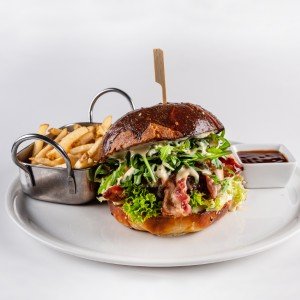 - 170 g / 500 g (hovädzie mäso, gorgonzola, rukola, slanina, figový džem, dijon-medová emulzia, kučeravý šalát, maslová brioška, hranolky, coleslaw, BBQ)1,3,7,10