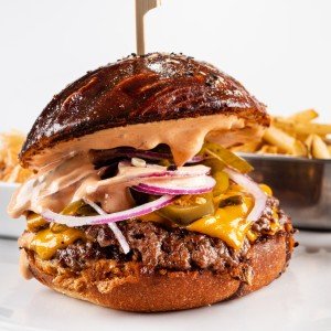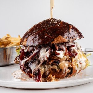 - 170 g / 490 g (hovädzie mäso, zrejúci cheddar, chrumkavá slanina, karamelizovaná cibuľa na tmavom pive, nakladaná uhorka, Beer BBQ omáčka, kučeravý šalát, maslová brioška, hranolky, coleslaw, BBQ)1,3,7,10