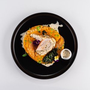 - 180 g / 200 g (kurací faš, mrkvové pyré, bylinkový velouté)7